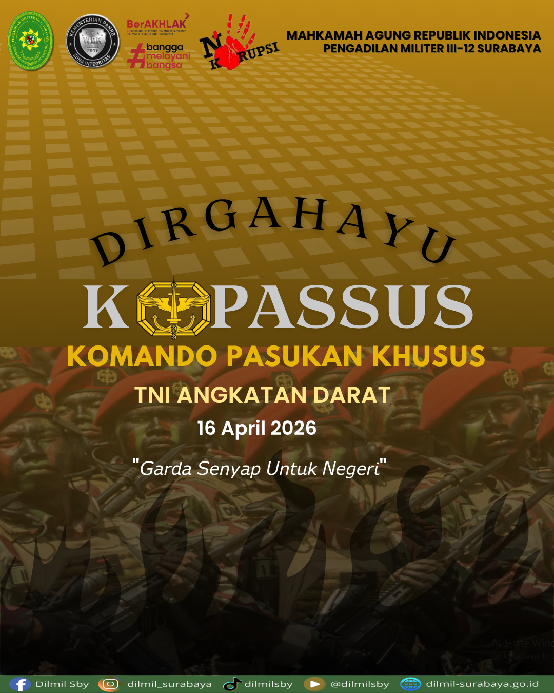 Keluarga Besar Pengadilan Militer III-12 Surabaya mengucapkan Dirgahayu Kopassus (Komando Pasukan Khusus) TNI Angkatan Darat ” Garda Senyap Untuk Negeri”