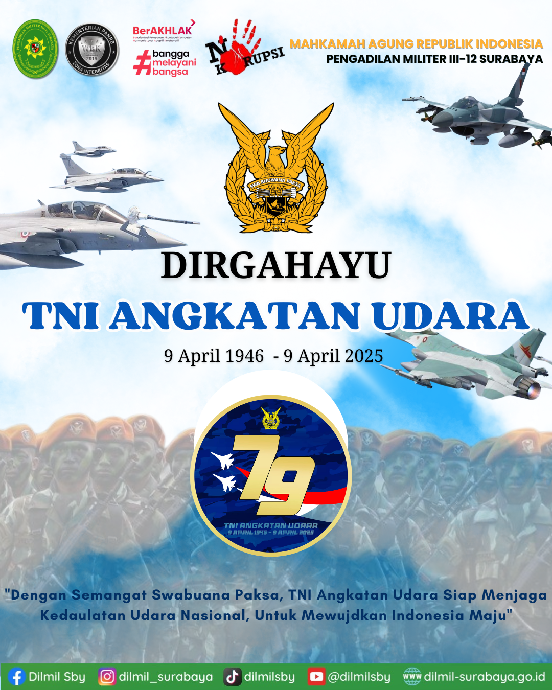 Keluarga Besar Pengadilan Militer III-12 Surabaya mengucapkan Dirgahayu TNI Angkatan Udara ” Dengan semangan Swabuana Paksa, TNI AU siap menjaga kadaulatan udara Nasional, Untuk Mewujudkan Indonesia maju”