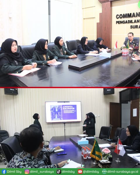 Para mahasiswa dari Fakultas Hukum Universitas Islam Negeri Sunan Ampel (UINSA) Surabaya melakukan kegiatan paparan akhir hasil kegiatan selama magang di Pengadilan Militer III-12 Surabaya di depan Kepala Pengadilan Militer III-12 Surabaya Kolonel Laut (H) Amriandie, S.H., M.H, beserta Hakim Militer Mayor Laut (H) Mirza Ardiansyah, S.H., M.H., M.AP sebagai Hakim Pembimbing dan Sekretaris Firda Nuril Hanifah, S.Si.,M.PSDM.