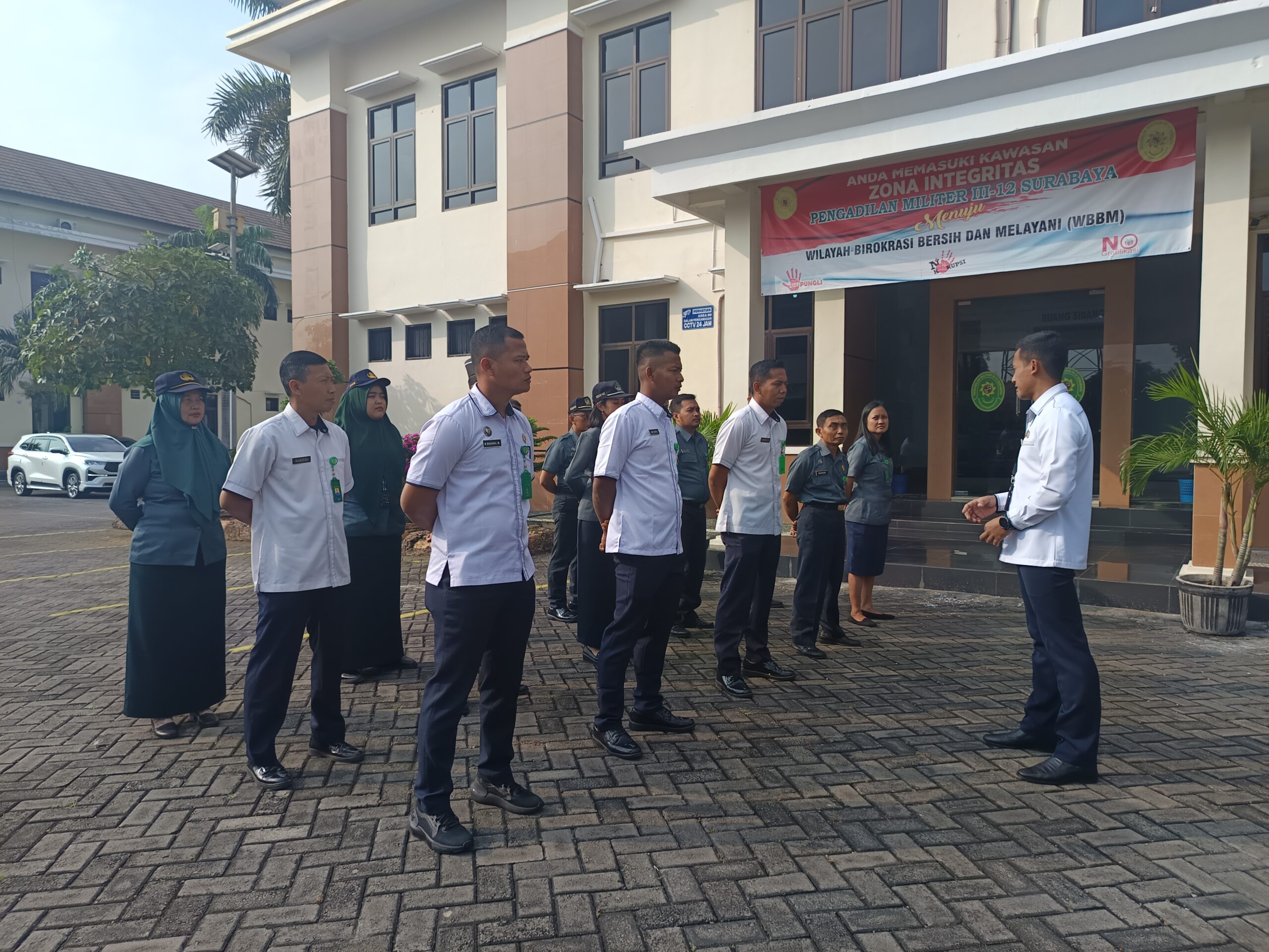 Panitera Muda Pidana Pengadilan Militer III-12 Surabaya Lettu Kum Destri Prasetyoandi, S.H., M.H. memimpin kegiatan PBB untuk personel Pengadilan Militer III-12 Surabaya. Panitera Pengganti Peltu Rudianto, S.H. memimpin kegiatan PBB untuk mahasiswa magang.
