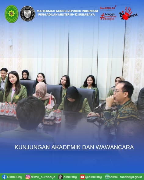 Kepala Pengadilan Militer III-12 Surabaya menyambut kedatangan mahasiswa Fakultas Hukum Universitas Pembangunan Nasional “Veteran” Jawa Timur (UPN “Veteran” Jatim) melaksanakan sesi wawancara akademik di Pengadilan Militer III-12 Surabaya dalam rangka Tugas Mata Kuliah Hukum Militer.