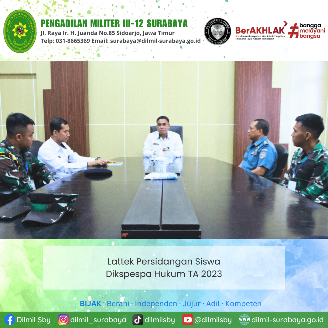 Pada hari Rabu tanggal 11 Oktober 2023 Pengadilan Militer III-12 Surabaya menerima kunjungan dari Siswa Dikspespa Hukum TA 2023. Kunjungan ini dalam rangka Latihan Praktek (Lattek) Persidangan.
