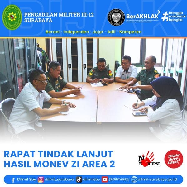 Hakim Militer Letkol Chk Muhamad Saleh, S.H. selaku Penanggung Jawab Kelompok Kerja Area II Penataan Tata Laksana memimpin rapat tindak lanjut atas monitoring dan evaluasi (monev) pada Area II.