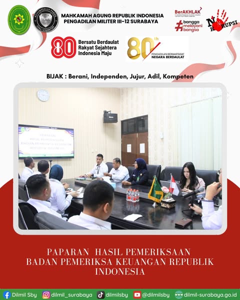 Bertempat diruang command center Pengadilan Militer III-12 Surabaya dilaksanakan kegiatan Paparan Hasil Pemeriksaan Badan Pemeriksa Keuangan Republik Indonesia. Paparan Hasil Pemeriksaan BPK RI dipaparankan oleh Panitera Muda Pidana Lettu Kum Destri Prasetyoandi, S.H., M.H. dihadapan Tim BPK RI beserta Kepala Pengadilan Militer III-12 Surabaya, Hakim Militer, Panitera dan Sekretaris.