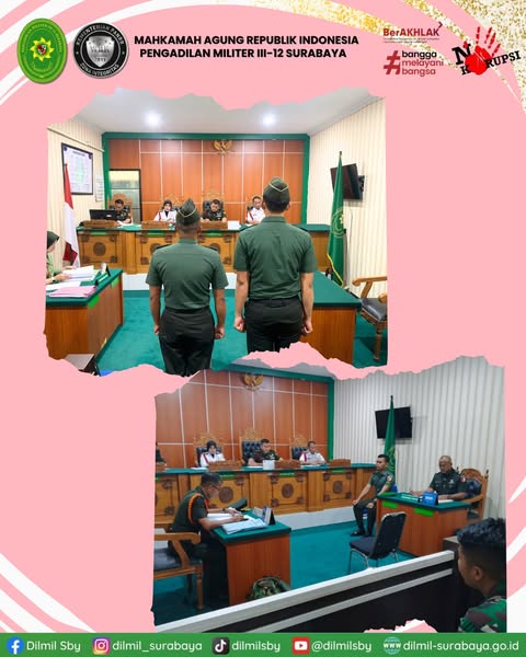 08/10/2025 - In Berita By Dilmil III-12 Admin 2 Comment off Pelaksanaan Sidang Keliling Pengadilan Militer III-12 Surabaya melaksanakan sidang keliling di Kota Malang. Pelaksanaan sidang keliling ini dimulai sejak tanggal 6 s.d. 9 Oktober 2025 bertempat di Pengadilan Agama Kota Malang.#dilmil #dilmilsby #dilmilsurabaya #pengadilan #Peradilan #pengadilanmiliter #pengadilanmilitersurabaya #berakhlak #ASNBerAKHLAK #BanggaMelayaniBangsa #ReformasiBirokrasi #WBKWBBM #kemenPANRB #mahkamahagungRI #zonaintegritas #wilayahbebaskorupsi #wbk #sidang #sidangkeliling Previous Upacara Ziarah Nasional dalam rangka Peringatan HUT TNI Tahun 2025 Next Monitoring dan evaluasi Mahasiswa Magang