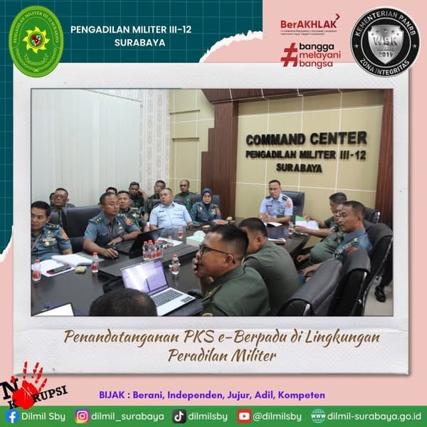 Wakil Kepala Pengadilan Militer III-12 Surabaya Letnan Kolonel Kum Jonarku, S.H.,M.H beserta seluruh personel mengikuti acara Penandatanganan Perjanjian Kerja Sama (PKS) Implementasi Aplikasi e-Berpadu dalam penyelesaian pidana dan perkara koneksitas di lingkungan Peradilan Militer. Kegiatan ini diselenggarakan oleh Direktorat Jenderal Badan Peradilan Militer dan Peradilan Tata Usaha Negara secara daring.