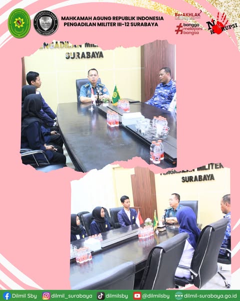 15/09/2025 - In Berita By Dilmil III-12 Admin 2 Comment off Penerimaan Mahasiswa dari Universitas Trunojoyo Bertempat diruang command center Kepala Pengadilan Militer III-12 Surabaya beserta Panitera dan Sekretaris menerima Mahasiswa dari Universitas Trunojoyo Madura yang akan melaksanakan magang di Pengadilan Militer III-12 Surabaya.#humasmahkamahagung#ditjenbadilmiltun#dilmil #dilmilsby #dilmilsurabaya #pengadilan #Peradilan #pengadilanmiliter #pengadilanmilitersurabaya #berakhlak #ASNBerAKHLAK #BanggaMelayaniBangsa #ReformasiBirokrasi #WBKWBBM #kemenPANRB #mahkamahagungRI #zonaintegritas #wilayahbebaskorupsi #wbk #dilmiltama Previous Pisah sambut Kepala Pengadilan Militer Tinggi III Surabaya Next Kegiatan Entry Briefing