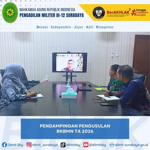Sekretaris Pengadilan Militer III-12 Surabaya didampingi Kasubbag Umum dan Keuangan serta Operator BMN mengikuti Pengusulan RKBMN Tahun Anggaran 2026 melalui Aplikasi e-Sadewa. Kegiatan yang diselenggarakan secara daring melalui Zoom Meeting ini dilaksanakan di Ruang Command Center Pengadilan Militer III-12 Surabaya.