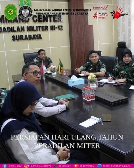 Bertempat Diruang Command Center Wakil Kepala Pengadilan Militer III-12 Surabaya Letnan Kolonel Chk Agustono, S.H., M.H. beserta Hakim Militer, Panitera, Sekretaris dan Para Kasubbag Melaksanakan Rapat Dalam Rangka Persiapan Ulang Tahun Peradilan Militer.