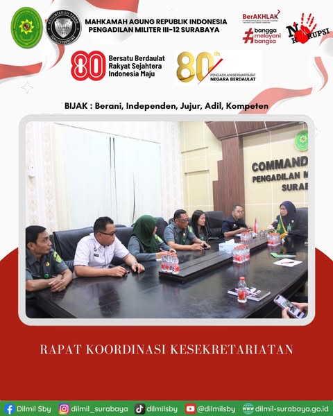 Bertempat diruang command center Pengadilan Militer III-12 Surabaya dilaksanakan kegiatan rapat koordinasi kesekretariatan yang dihadiri seluruh personel kesekretariatan. Rapat koordinasi di pimpin langsung oleh Sekretaris Firda Nuril Hanifah, S.Si.,M.PSDM.