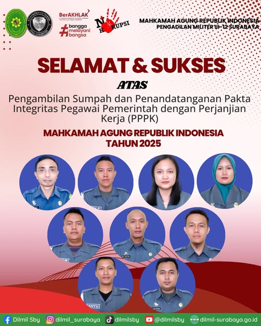 Keluarga Besar Pengadilan Militer III-12 Surabaya mengucapkan selamat dan sukse atas pengambilan sumpah dan penandatangan pakta integritas Pegawai Pemerintah dengan Perjanjian Kerja (PPPK).